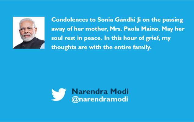PM conveys his condolences to Smt Sonia Gandhi on passing away of her mother